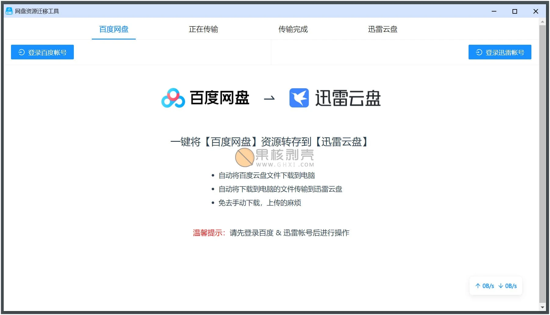 软件使用很方便,首先登录百度网盘账号,然后登录迅雷账号。接下来选中百度网盘中要转存的文件,接下来选中迅雷网盘中保存的位置,点击转存就行。