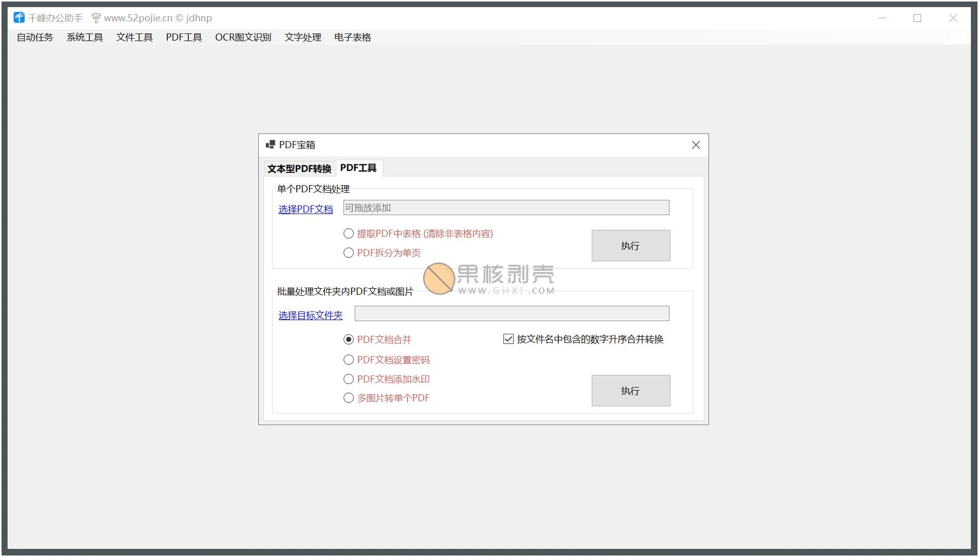 千峰办公助手一款 集成了自动任务、文件工具、PDF工具、OCR图文识别、文字处理、电子表格六大类30余项实用功能办公软件,开发目的是解决常见办公痛点,把机械的操作还给机器,实现轻松、高效办公。