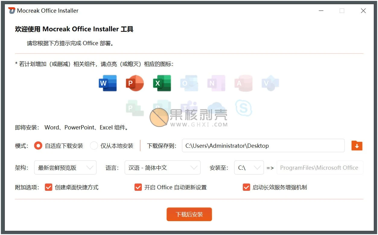 Mocreak 一键自动化、无人值守下载、安装、部署并激活Office 的利器,支持 Win11、Win10 等操作系统,自适应匹配 x86、x64 架构。可以一键安装,也可以卸载旧版本的office,如果有旧版本,如果不卸载直接安装也是可以的,安装中会提示兼容问题,并选择卸载旧版本。