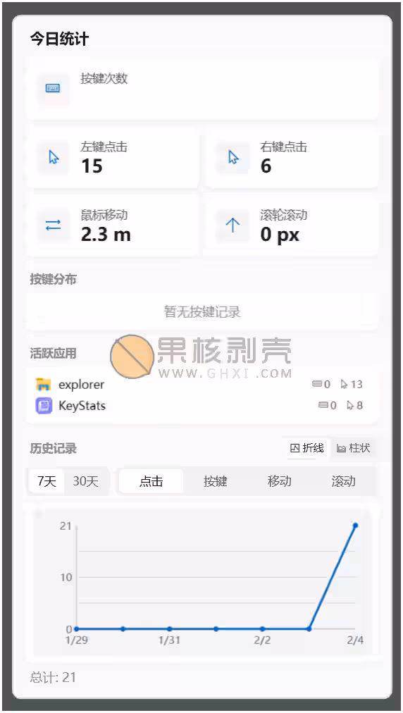 KeyStats 是一款轻量级开源菜单栏应用,可以统计用户每日的键盘敲击次数、鼠标点击次数、鼠标移动距离和滚动距离。