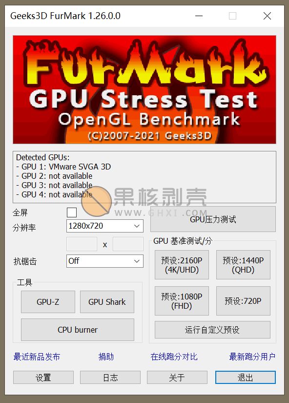Geeks3D FurMark,GPU压力测试工具(烧机软件),显卡性能测试软件,显卡OpenGL基准测试工具,支持单卡/多卡烤机模式,主要用于测试NVIDIA GeForce/AMD Radeon/Intel HD Graphics 的显卡满血负载下的CPU负载频率和功率及温度,采用皮毛渲染算法来衡量显卡性能。提供了多种测试选项,例如全屏/窗口显示模式、预设常见分辨率、基于时间或帧的测试形式、多种多重采样反锯齿(MSAA)、游戏模式等。