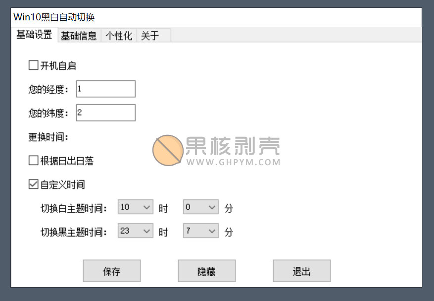 本软件是果核朋友开发的一款小工具,能过根据你的经纬度确定白天和黑夜,来自动切换Windows10暗色和亮色主题,以及壁纸。