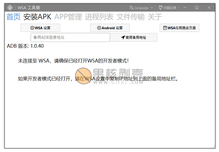 WSA工具箱,支持在Windows安卓子系统中安装APK、管理后台APP、查看进程以及传输文件。