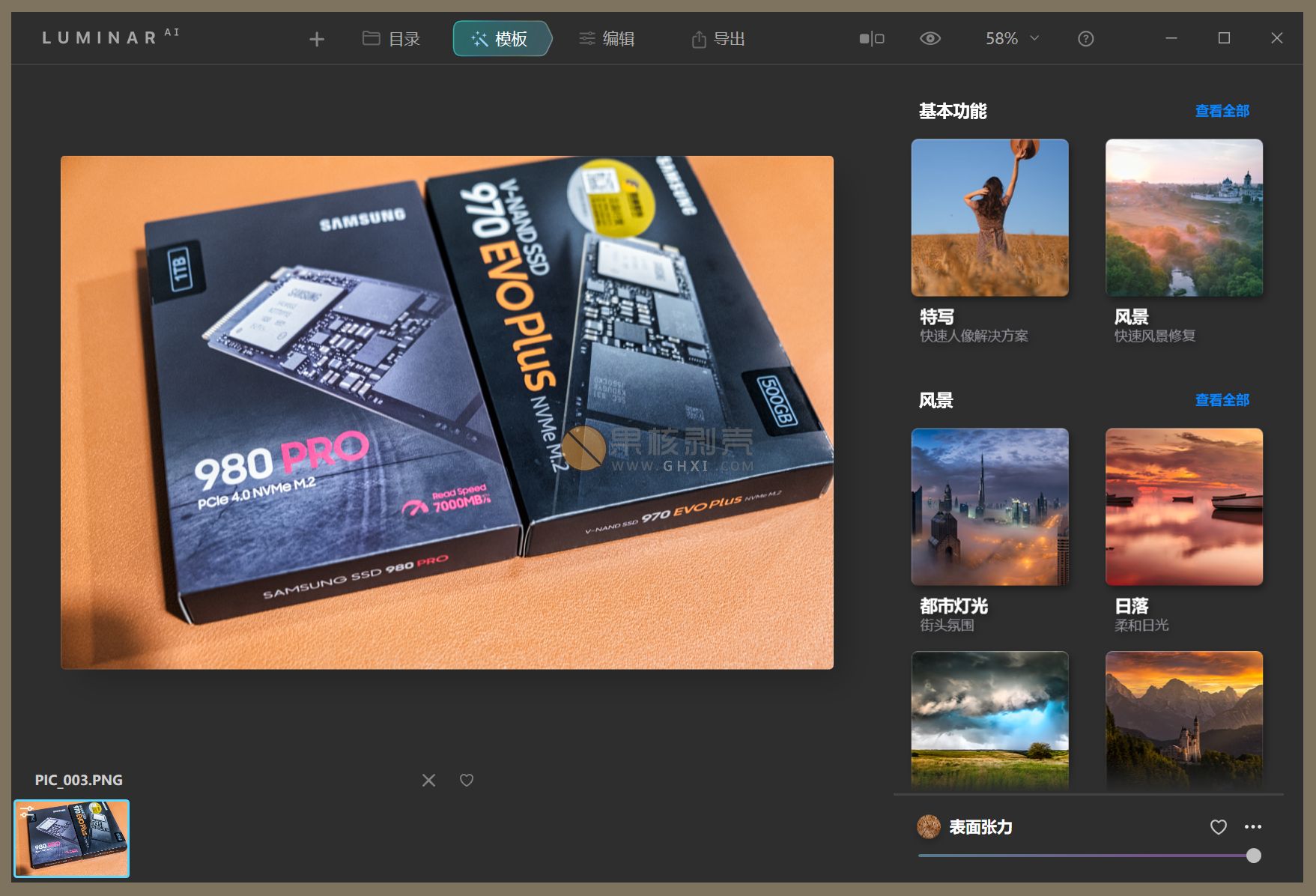 Luminar AI,号称全球第一款完全由AI人工智能实现的图像处理软件。提供了智能识别场景、智能编辑面板,一键抠图替换天空、智能人像处理(一键提亮脸部、一键瘦脸瘦身、消除红眼、去除黑眼圈)等功能。