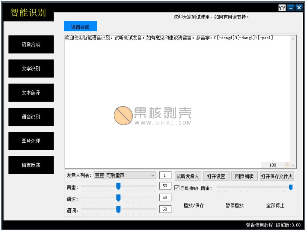 语音合成:有上百种音色,多音字也能自己设置,只需要加上中括号和等于符号,在等于符号后面写上拼音和声调就可以了,比如这样:1[=yao1] 。