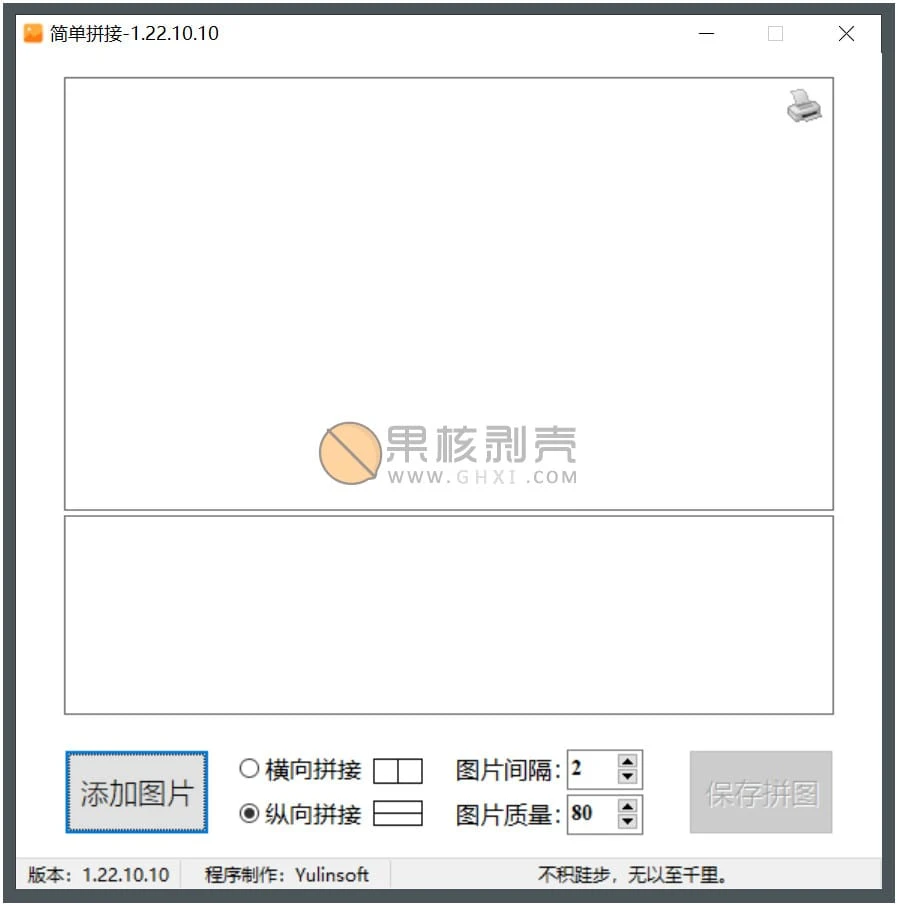 简单拼接 是一款由 Yulinsoft 开发的 Windows 小工具,用来将多张图片横向、纵向拼接成一张图片,支持设置间隔、图片质量。