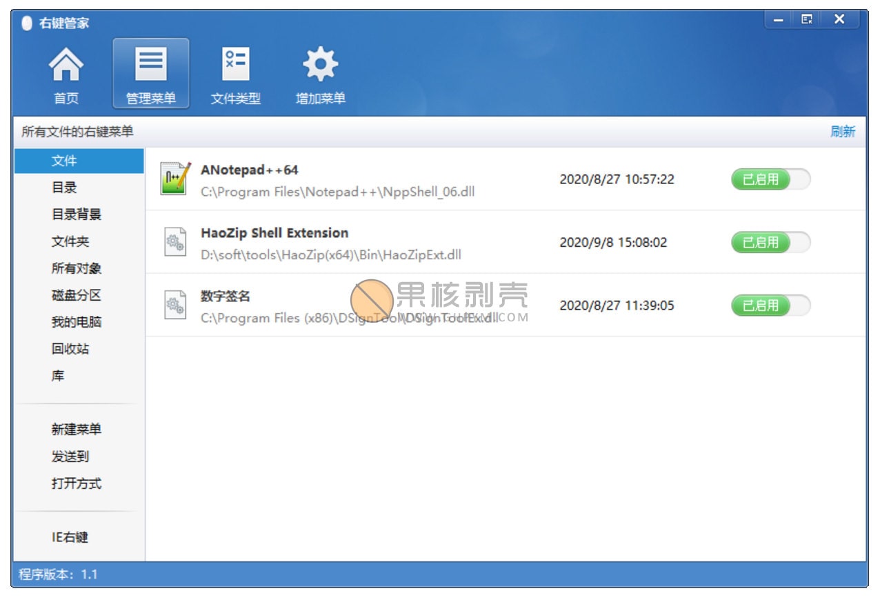 电脑右键菜单管家,是果核用过这么多的右键管理软件中,做的最好的,不仅分类明确,界面也做的非常好看,并且除了能管理右键菜单以外,还能给右键菜单增加功能。